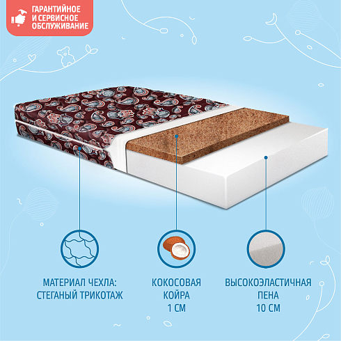 Детский матрас Nuovita Gradito Hamsa 120x60 см выдерживает нагрузку до 30 кг. Высота матраса 12 см (Schiuma Elastica 10 см + кокос 2 см.), склеивание выполнено по технологии "Hot-Melt". Разная жесткость сторон ("средняя" и "жесткая").